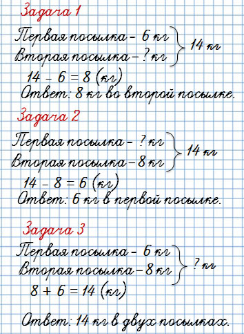 2. В одной посылке было 6 кг яблок. Сколько килограммов яблок было в другой посылке, ес­ли всего в двух посылках было 14 кг яблок? Составь две задачи, обратные данной. Реши их.