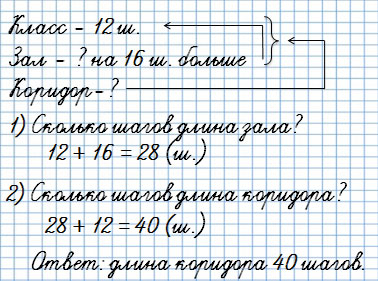 3. Аня измерила шагами длину класса, зала и ко­ридора. У неё получилось: длина класса 12 ша­гов, длина зала на 16 шагов больше, чем дли­на класса, а длина коридора равна длине класса и зала вместе. Объясни, что обозначают выражения: