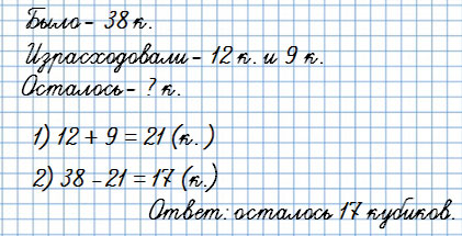 25. В коробке было 38 кубиков. Из 12 кубиков Дима построил дом, а из 9 — башню. Сколько кубиков осталось в коробке? Закончи вопрос и реши задачу.