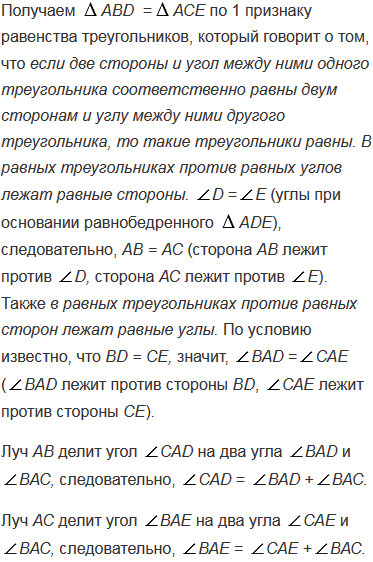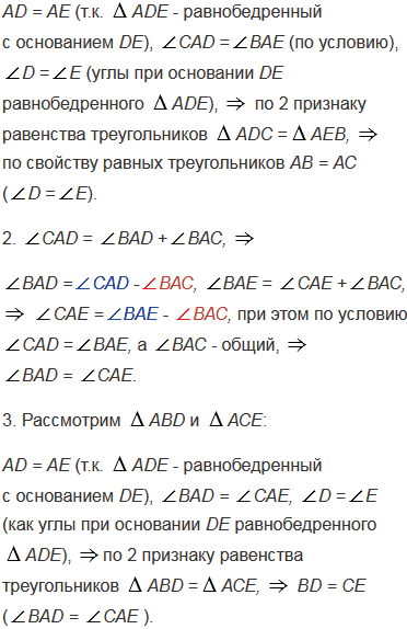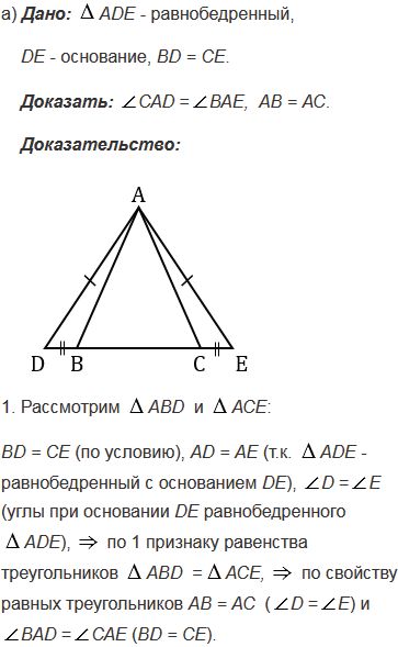 На рисунке 98 треугольник АDЕ равнобедренный, DE - основание. Докажите, что: а) если ВD = СЕ, то САD =ВАЕ и АВ = АС; б) если САD =ВАЕ, то ВD = CЕ и АВ = АС.