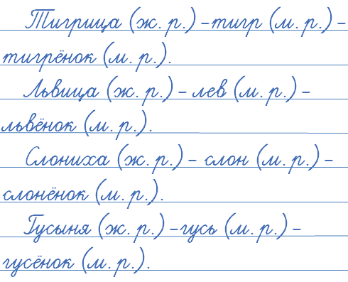 Тигрица (ж. р.) — тигр (м. р.) — тигрёнок (м. р.).