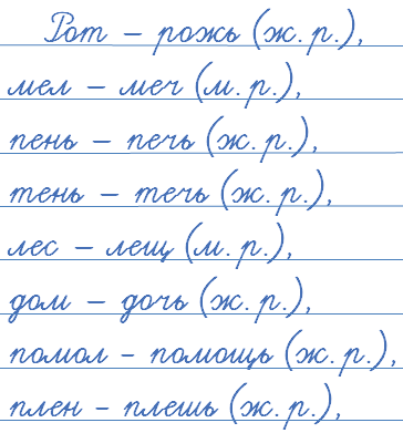 Рот — рожь (ж. р.), мел — меч (м. р.),