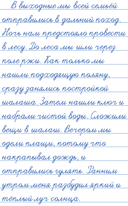 Мы с классом отправились в дальний поход. Ночь решили провести в лесу. Мы нашли ключ и набрали воды. Развели костёр, поставили палатку и даже сделали шалаш для игр. Я укутался в плащ и слушал истории друзей. Было страшно и весело. Утром меня разбудил солнечный луч. Лес выглядел радостным. Хорошая вещь - поход с друзьями!