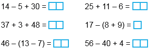 14 - 5 + 30 = 39 1) 14 - 5 = 9 2) 9 + 30 = 39 |
