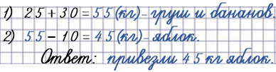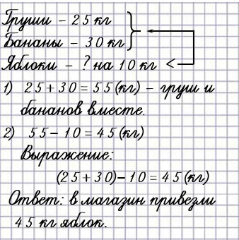 В магазин привезли 25 кг груш, 30 кг бананов, а яблок — на 10 кг меньше, чем груш и бананов вместе. Сколько килограммов яблок привезли в магазин?