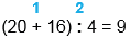 1) 20 + 16 = 36 2) 36 : 4 = 9 |