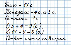 В кинофильме 17 серий. В первую неделю мая показали 4 серии, а во вторую — 5. Сколько серий кинофильма осталось показать?
