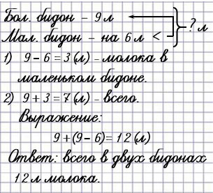 В большом бидоне 9 л молока, а в маленьком - на 6 л меньше. Сколько всего литров молока в этих бидонов?