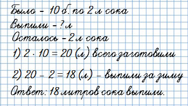 3. На зиму семья заготовила 10 двухлитровых ба­нок яблочного сока. К весне осталось только 2 л сока. Сколько литров сока выпито за зиму?
