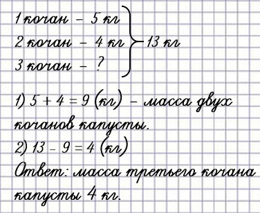 4. В столовой на приготовление щей и салата из­расходовали 3 кочана капусты. Масса первого кочана 5 кг, второго 4 кг. Узнай массу третье­го кочана, если масса всех трёх кочанов 13 кг.