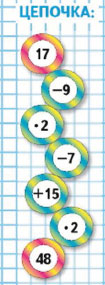 8 • 5 = 40 7 • 5 + 6 = 41 9 • 3 - 12 = 15 24 : 3 + 17 = 25