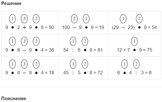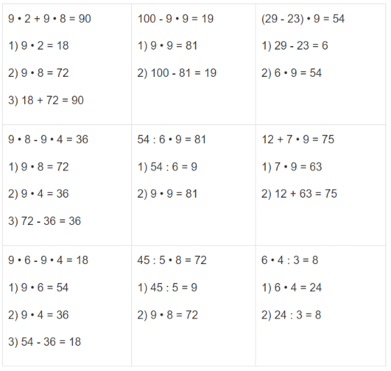 | 9 • 8 - 9 • 4 | 54 : 6 • 9 | 12 + 7 • 9 |