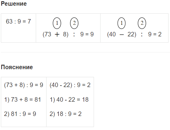 | 63 : 9 | (73 + 8) : 9 | (40 - 22) : 9 |