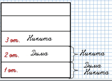 С первого до второго этажа ребята идут вместе и проходят какое-то количество ступенек. Дима остаётся, потому что живёт на 2 этаже, а Никита проходит ещё столько же и поднимается на 3 этаж. Получается, что Никита проходит в два раза больше ступенек, чем Дима.