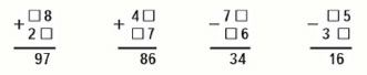 | 9 + 8 | 36 + 23 | 17 + 50 | 87 - 43 |