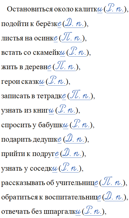 Остановиться около калитки (Р. п.), подойти к берёзке (Д. п.), листья на осинке (П. п.), встать со скамейки (Р. п.), жить в деревне (П. п.), герои сказки (Р. п.), записать в тетрадке (П. п.), узнать из книги (Р. п.), спросить у бабушки (Р. п.), подарить дедушке (Д. п.), прийти к подруге (Д. п.), узнать у соседки (Р. п.), рассказывать об учительнице (П. п.), обратиться к воспитательнице (Д. п.), отвечать без шпаргалки (Р. п.), не услышал подсказки (Р. п.), рассказывал без подготовки (Р. п.), прочитал в книге (П. п.).