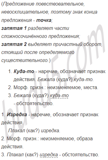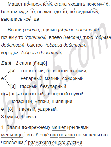 1. Вдали (по)прежнему машет крыльями мельница, и всё ещё1 она похожа на маленького человечка, размахивающего руками.5 2. Бричка ехала прямо, а мельница почему(то) стала уходить влево. 3. Вода падала на землю и, прозрачная, весёлая, сверкая на солнце и тихо ворча, точно воображая себя сильным и бурным потоком, быстро бежала куда(то)3 влево. 4. Где(то) не близко плакал чибис и изредка3 раздавался писк трёх бекасов. 5. Дениска перегнал Егорушку и, (по)видимому, остался этим очень доволен. 6. (Кое)где на равнине высились небольшие курганы и летали вчерашние грачи.