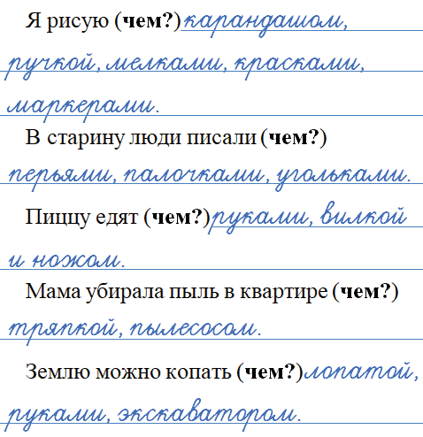 Мама убирала пыль в квартире (чем?) веником, тряпкой, пылесосом.