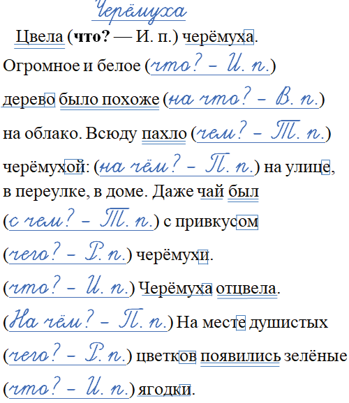 Цвела (что? — И. п.) черёмуха. Огромное и белое (__) дерево было похоже (__) на облако. Всюду пахло (__) черёмухой: (__) на улице, в переулке, в доме. Даже чай был (__) с привкусом (__) черёмухи. (__) Черёмуха отцвела. (__) На месте душистых (__) цветков появились зелёные (__) ягодки.