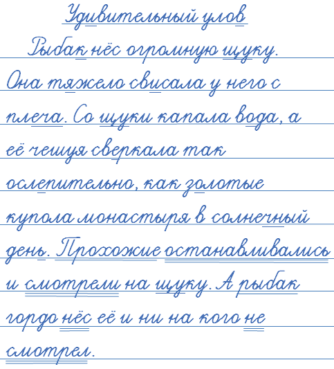 Рыбак нёс огромную щуку. Щука тяжело свисала у него с плеча. Со щуки капала вода, а чешуя щуки сверкала так ослепительно, как золотые купола монастыря в солнечный день. Прохожие останавливались и смотрели на щуку. А рыбак гордо нёс щуку и ни на кого не смотрел.
