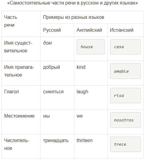 Составьте таблицу «Самостоятельные части речи в русском и других языках (английском, немецком, французском и др.)». Отберите и систематизируйте примеры, заполните ими графы таблицы.