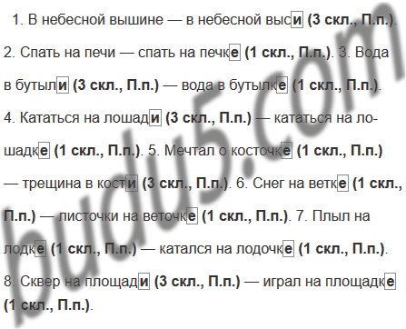 1. В небесной вышине — в небесной выс.. . 2. Спать на печи — спать на печк.. . 3. Вода в бутыл.. — вода в бутылк.. . 4. Кататься на лошад.. — кататься на лошадк.. . 5. Мечтал о косточк.. — трещина в кост.. . 6. Снег на ветк.. — листочки на веточк.. . 7. Плыл на лодк.. — катался на лодочк.. . 8. Сквер на площад.. — играл на площадк.. .