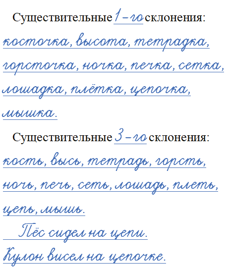 Существительные 3-го склонения: кость, высь, тетрадь, горсть, ночь, печь, сеть, лошадь, плеть, цепь, мышь.