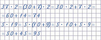 Число 37 представлю в виде суммы разрядных слагаемых 30 и 7. Эту сумму надо умножить на 2.