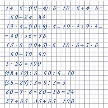 14 • 6 = 84 1) 14 = 10 + 4 2) 10 • 6 = 6- 3) 4 • 6 = 24 4) 60 + 24 = 84 |