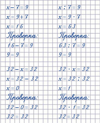 | х - 7 = 9 | 32 - х = 32 | 62 + х = 62 |
