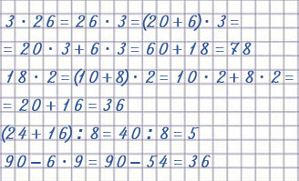3 • 26 = 26 • 3 = 78 1) 26 = 20 + 6 2) 20 • 3 = 60 3) 6 • 3 = 18 4) 60 + 18 = 78 |