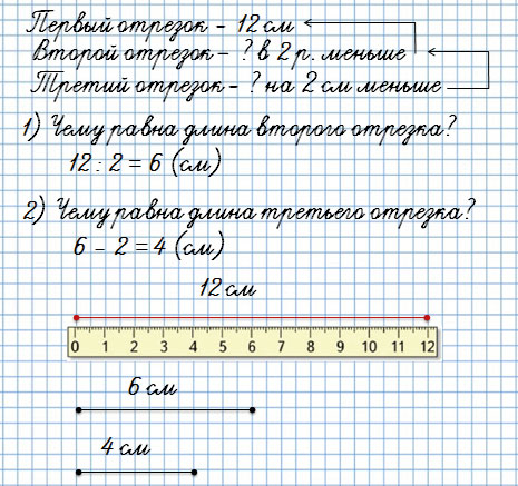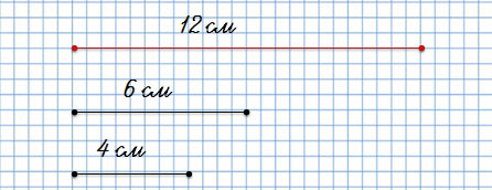 6. Начерти 3 отрезка: длина первого 12 см, длина второго равна половине длины первого, а длина третьего на 2 см меньше длины второго.