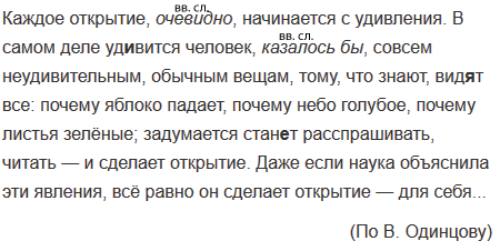 Каждое открытие очевидно начинается с удивления. В самом деле уд..вится человек казалось бы совсем неудивительным, обычным вещам, тому что знают вид..т все: почему яблоко падает почему небо голубое почему листья зелёные; задумается стан..т расспрашивать читать — и сделает открытие. Даже если наука объяснила эти явления всё равно он сделает открытие — для себя...