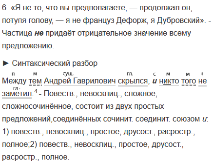 1. Между тем Андрей Гаврилович скрылся, и (ни)кто того не заметил.4 2. Кирила Петрович сел ужинать и только тогда, не видя Дубровского, хватился о нём. 3. Троекуров велел тотчас его догнать и воротить (непременно). Отроду не выезжал он на охоту без Дубровского. 4. Слуга, поскакавший за ним, воротился и доложил своему господину, что, дескать, Андрей Гаврилович не послушался и не хотел воротиться. 5. Письмо рассердило Кирила Петровича не странным слогом и расположением, но только своею сущностью. 6. «Я не то, что вы предполагаете, — продолжал он, потупя голову, — я не француз Дефорж, я Дубровский».