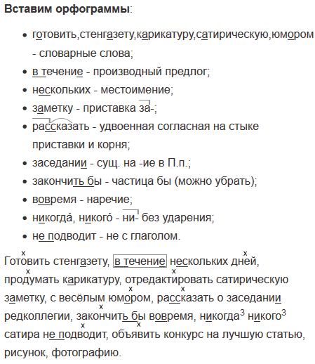Готовить стенг..зету, (в)течени.. (не)скольких дней, продумать к..рикатуру, отредактировать сатирическую з..метку, с весёлым юм..ром, ра(с, сс)казать о заседани.. редколлегии, закончить(бы) (во)время, н..когда3 н..кого3 сатира (не)подводить, объявить конкурс на лучшую статью, рисунок, фотографию.
