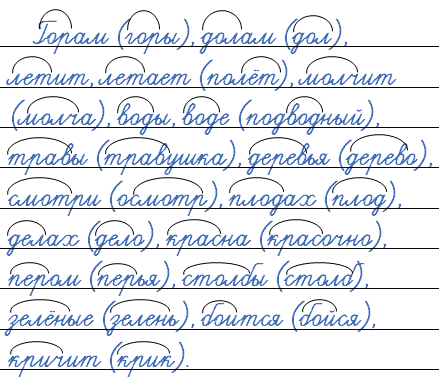 1. По г..рам, по д..лам ходит шуба да кафтан. (Баран) 2. Л..тит - говорит, а сядет - м..лчит. (Оса) 3. Много в..ды - много тр..вы. 4. Д..ревья см..три в пл..дах, а человека - в д..лах. 5. Птица кр..сна п..ром, а человек - трудом. 6. Стоят ст..лбы белёные, на них шапочки з..лёные. 7. В в..де родится, а в..ды б..ится. 8. Днём м..лчит, ночью кр..чит, по лесу л..тает, прохожих пугает.