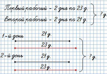 4. Один рабочий изготавливал за день 23 детали, а другой — 21 деталь. Сколько деталей изго­товят оба рабочих за 2 дня?