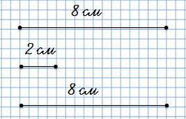 3. Начерти три отрезка: длина первого отрезка 8 см, длина второго составляет одну четвёртую длины первого, а длина третьего на 6 см боль­ше длины второго.