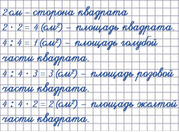 Чтобы найти площадь розовой части квадрата, нужно всю площадь разделить на 4 части и взять ТРИ части:
