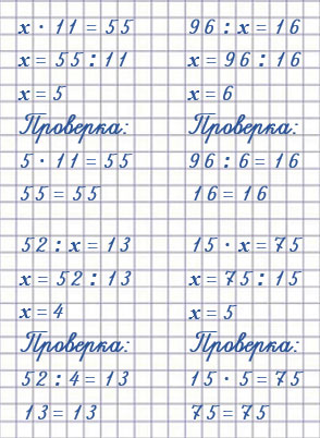 Чтобы найти неизвестный делитель, нужно делимое разделить на частное (уравнения 96 : х = 16 и 52 : х = 13).