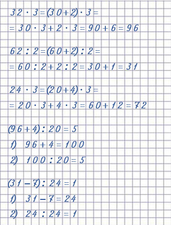 32 • 3 = (30 + 2) • 3 = 90 + 6 = 96 |