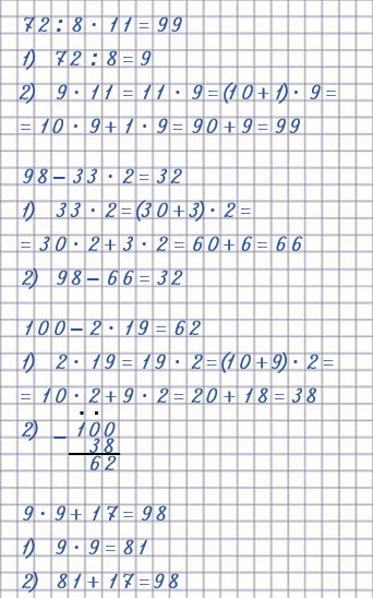 | 32 • 3 | (96 + 4) : 20 | 98 - 33 • 2 |