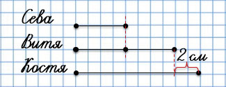 13. Определи без измерений, где чей прямоугольник, если Витя начертил прямоугольник, площадь которого на 2 см² меньше, чем площадь прямоугольника у Кости, но в 2 раза больше, чем площадь прямоугольника у Севы.