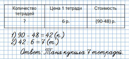 7. У Тани было 90 р. После того как она купила несколько тетрадей, по 6 р. каждая, у неё осталось 48 р. Сколько тетрадей купила Таня?