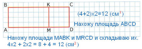2) Запиши и объясни, как можно найти площадь прямоугольника ABCD, умножая сумму на число, и как можно найти его площадь другим способом.