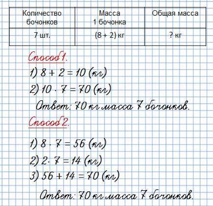 26. Масса пустого бочонка 2 кг. В него входит 8 кг мёда. Найди массу 7 таких бочонков, наполненных мёдом.