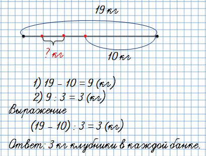 Мама купила 19 кг клубники. Из 10 кг она сварила варенье, а остальную клубнику разложила в