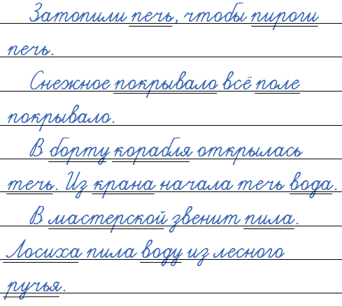 Определим значения выделенных слов. Затопили (что?) печь (каменное или металлическое сооружение для отопления помещений, приготовления горячей пищи), чтобы пироги печь (готовить пищу сухим нагреванием на жару). Снежное покрывало (ткань для покрывания чего-либо) всё поле покрывало (опустилось сверху на что-либо). В борту корабля открылась течь (место, из которого прорывается вода). Из крана начала течь (литься непрерывной струей, потоком; струиться) вода. В мастерской звенит пила (инструмент). Лосиха пила (поглощала) воду из лесного ручья.