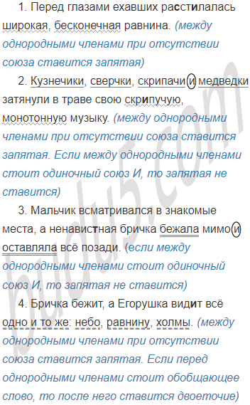 4. Бричка бежит, а Егорушка видит всё одно и то же: небо, равнину, холмы. - однородные дополнения стоят после обобщающего слова, отделены от него двоеточием и связаны между собой бессоюзной связью с помощью запятых.