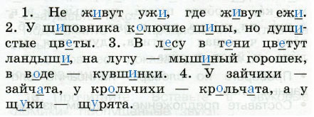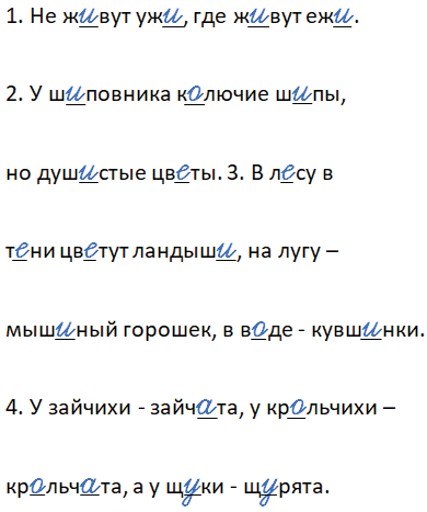 1. Не ж_вут уж_, где ж_вут еж_. 2. У ш_повника к_лючие ш_пы, но душ_стые цв_ты. 3. В л_су в т_ни цв_тут ландыш_, на лугу - мыш_ный горошек, в в_де - кувш_нки. 4. У зайчихи - зайч_та, у кр_льчихи - кр_льч_та, а у щ_ки - щ_рята.